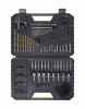 Garnitura 100 delni set svedrov v trpežnem kovčku. Garnitura vsebuje: - 13 svedrov za les - 13 svedrov za kovino - 5 svedrov za beton - 4 kronske žage in vretena - 2 hex ključa - 7 nasadni ključi - trpežen kovček