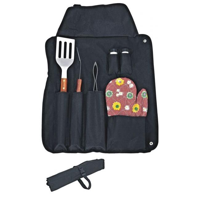 Štiridelni pribor za žar s predpasnikom in rokavico. Rokavica različni vzorci blaga.