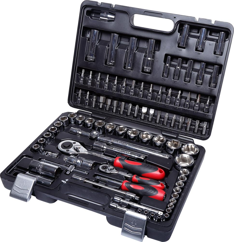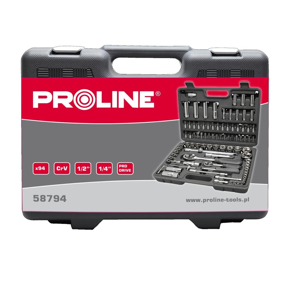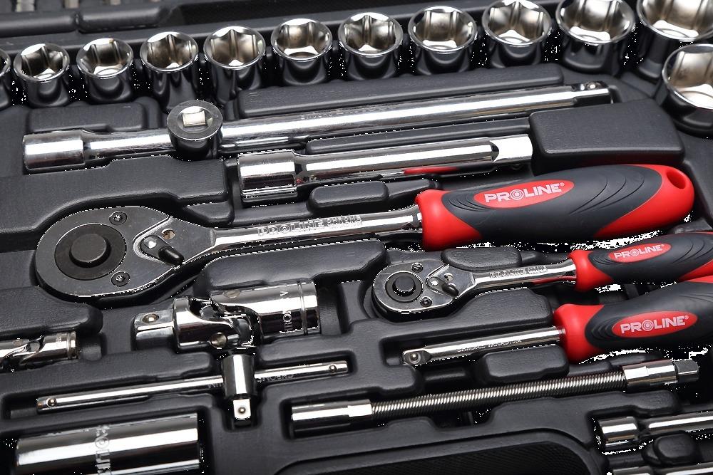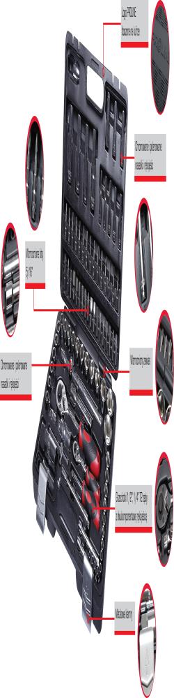 - 1/2 nastavek: 10, 11, 12, 13, 14, 15, 16, 17, 18, 19, 20, 21, 22, 23, 24, 27, 30, 32 mm - 1/2 nastavek daljši HEX: 14, 15, 17, 19 mm - 1/2 nastavek daljši TORX: 16, 21 mm - 1/2 raglja 72 T - 1/2 podaljševalna ročica: 125, 250 mm - 1/2 bit nastavek - 1/2 adapter v zgibu socket - 1/2 nastavek 5/16 - 1/4 nastavek TORX 4, 4.5, 5, 5.5, 6, 7, 8, 9, 10, 11, 12, 13, 14 mm - 1/4 podaljšan nastavek TORX 6, 7, 8, 9, 10, 11, 12, 13 mm - 1/4 PH1, 2 PZ1, 2 4, 5.5, 7 mm TORX T8, T10, T15, T20, T25, T30 HEX 3, 4, 5, 6 mm - 5/16 PH1, 2 PZ1, 2 8, 10, 12 mm TORX T40, T45, T50, T55 HEX 8, 10, 12, 14 mm - 1/4 raglja 72 T - 1/4 podaljševalna ročica socket 50, 100 mm - 1/4 podaljševalna ročica gibljiva 150 mm - 1/4 adapter v zgibu socket - 1/4 T ključ - 1/4 raglja - 1/4 nastavek - ključ viličasti 1.5, 2, 2.5 mm Narejeno iz CrV, kromirani in poliran, v torbi s kovinskimi tečaji in kovinskimi zaponkami.