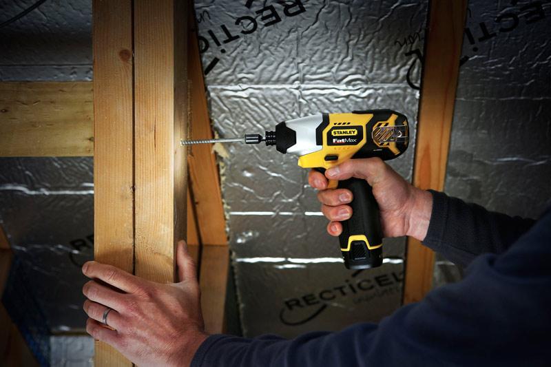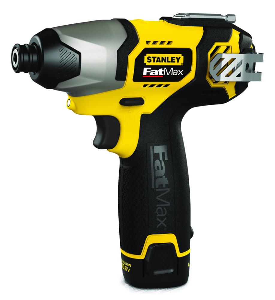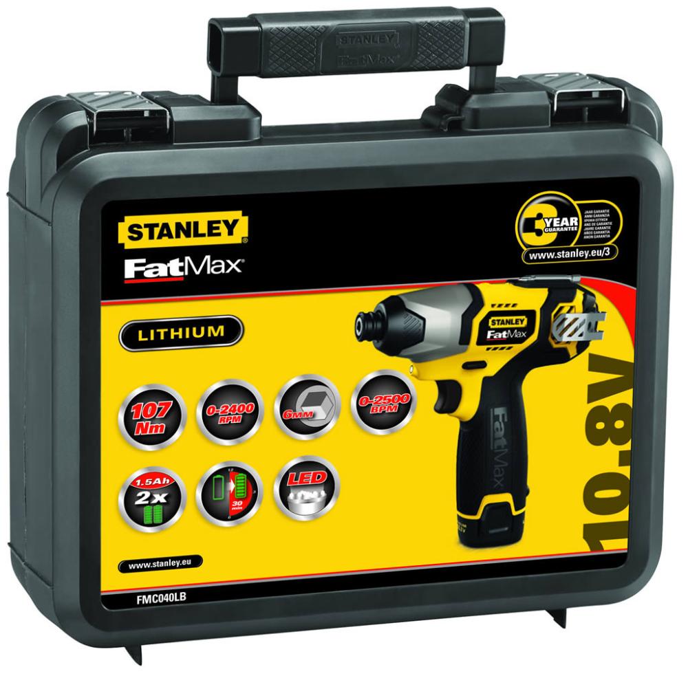Akumulatorski udarni vijačnik Stanley Fatmax FMC040LB je 10,8 V udarni vijačnik z 1/4'' (6,35 mm) Hex vpetjem. Zamenjava nastavka je hitra in enostavna. Vgrajeno ima LED svetilko za dobro osvetljeno delovno mesto in boljšo vidljivost. Ergonomsko oblikovan in gumiran ročaj uporabniku zagotavlja udobno in varno delo z manj vibracijami. Je kompakten, vzdržljiv in zmogljiv vijačnik. Majhna teža zmanjšuje utrujenost uporabnika pri dolgotrajnem delu. Ohišje je prilagojeno za delo tudi v utesnjenih zaprtih prostorih. Aluminijasti sprednji del ohišja zagotavlja boljše odvajanje toplote za daljšo življenjsko dobo motorja. V opremi sta 2 Li-Ion bateriji, hitri 30 minutni polnilnik z varčevanjem energije, zaponka za pas in kovček za varen transport. Lastnosti: - baterija: 10,8 V, 1,5 Ah, Li-Ion - vpenjalna glava: 1/4'' (6,35 mm) Hex - hitrost: 0-2.400 /min - št. udarcev: 0-2.500 /min - največji navor: 107 Nm - čas napajanja: 30 min - masa: 1,1 kg