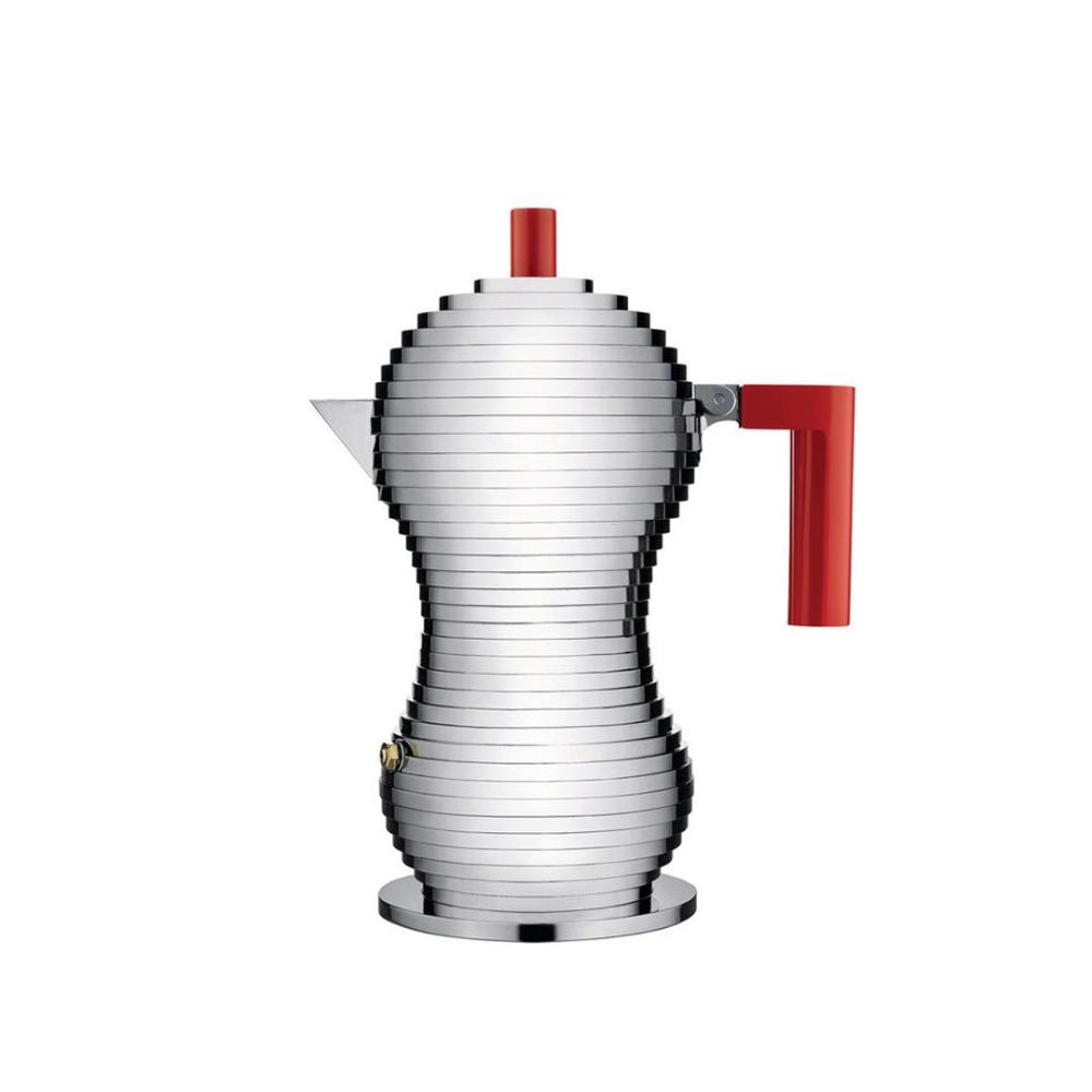 Značilno in futuristično KAFETIERO ZA ESPRESSO PULCINA, je za uglednega italijanskega proizvajalca ALESSI, zasnoval visoko priznani in spoštovani oblikovalec Michele De Lucci. Vsebuje majhno, a bistveno oblikovalsko inovacijo – to je, da se kuhanje ustavi ob pravem času, še preden kava dobi grenak priokus. Zaradi tega dobi boljšo aromo in polnejši okus. Izliv spominja na piščančji kljun (od tod tudi ime Pulcina - piščanec) in preprečuje kapljanje. Edinstven estetski italijanski slog je poudarjen s stopničastim ohišjem iz aluminija in rdečim ročajem. Edinstven in osupljiv videz kafetiere se bo podal v vse sodobne kuhinje in pisarne.