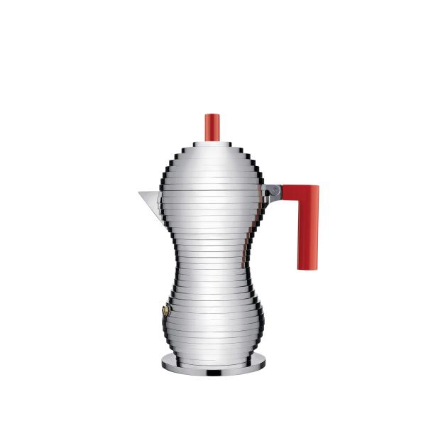 Značilno in futuristično KAFETIERO ZA ESPRESSO PULCINA, je za uglednega italijanskega proizvajalca ALESSI, zasnoval visoko priznani in spoštovani oblikovalec Michele De Lucci. Vsebuje majhno, a bistveno oblikovalsko inovacijo – to je, da se kuhanje ustavi ob pravem času, še preden kava dobi grenak priokus. Zaradi tega dobi boljšo aromo in polnejši okus. Izliv spominja na piščančji kljun (od tod tudi ime Pulcina - piščanec) in preprečuje kapljanje. Edinstven estetski italijanski slog je poudarjen s stopničastim ohišjem iz aluminija in rdečim ročajem. Edinstven in osupljiv videz kafetiere se bo podal v vse sodobne kuhinje in pisarne.