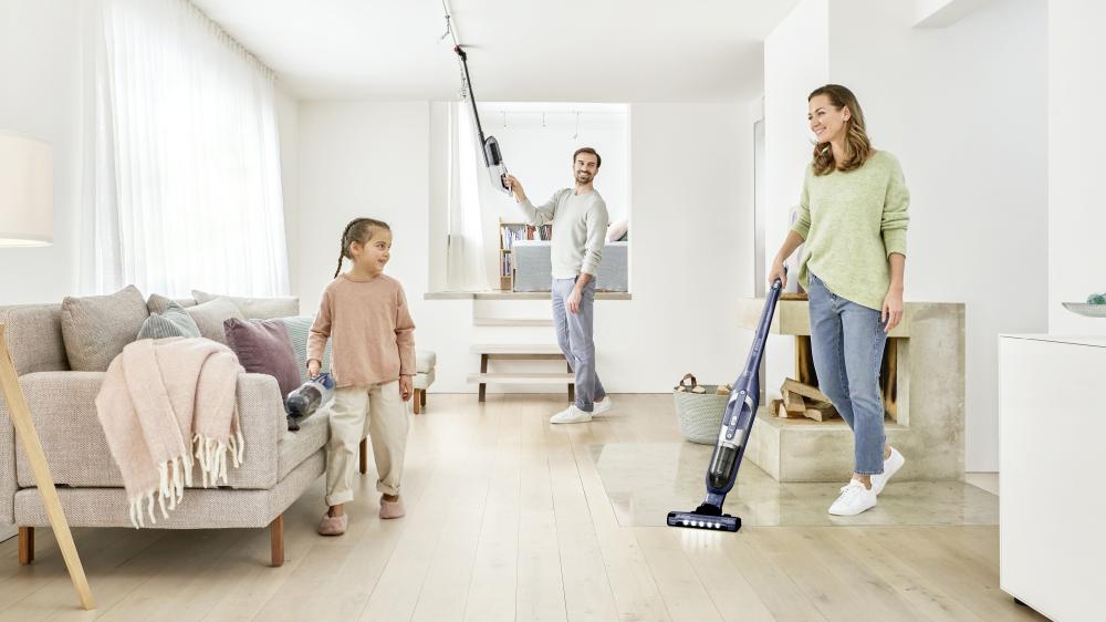 - Maksimalna prilagodljivost: brezžično sesanje brez omejitev, okoli pohištva in pod njim, zahvaljujoč premičnemu zglobu za nastavke