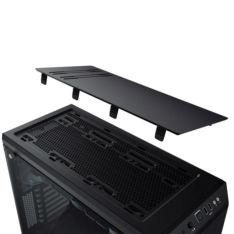 Zgornji pokrov Pure Base 600 je nastavljiv, kar omogoča izbiro med povečanjem hlajenja ali tišino vašega sistema. Lahko ga zapremo za več tišine, delno ga odprite za več zračenja ali pustite odprto, da namestite vodni hladilni radiator.
