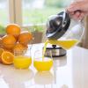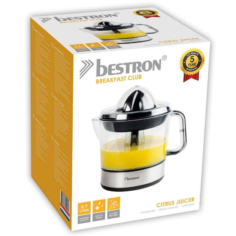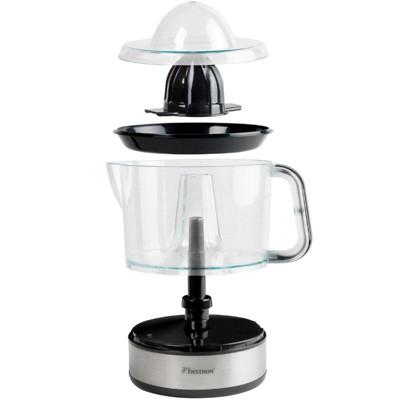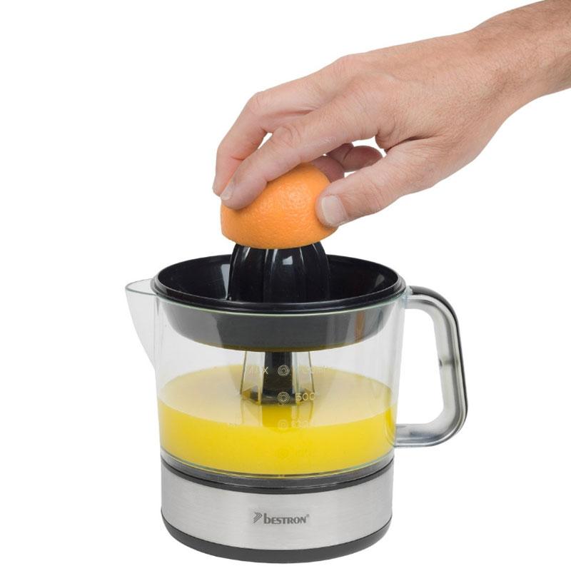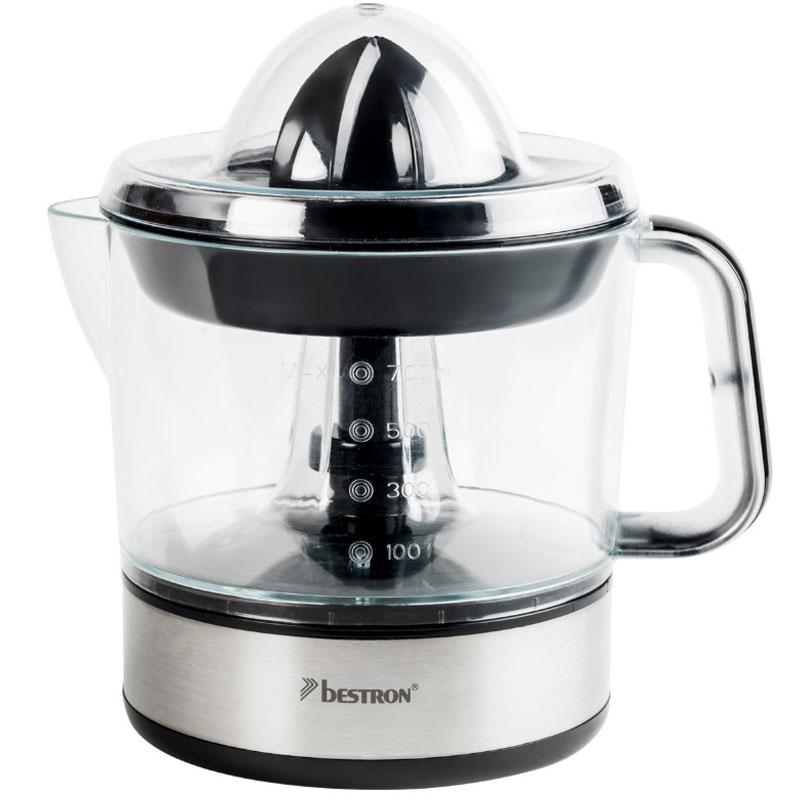 BESTRON ACJ350Z 0,7L ožemalnik citrusov ponuja veliko odstranljivo posodo za sok s približno 700 ml. Ožemalnik ima dve različni velikosti stiskalnic za vse vrste agrumov. Prozoren pokrov se lahko uporablja tudi kot pripomoček za stiskanje. Zelo enostavno čiščenje, vsi predmeti, razen ohišja motorja, so primerni za pomivanje v pomivalnem stroju. Z nedrsečimi nogicami bo ožemalnik ostal na mestu.