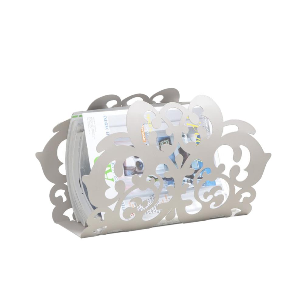 Izraz »baročno« je bil nekoč uporabljen za označevanje razkošnega, bizarnega, nepravilnega in … dragocenega sloga, takšnega, kot je Brandanijeva kolekcija »I preziosi«. Prefinjeni in elegantni dodatki za dom, za katere je značilno harmonično prepletanje kovinskih kodrov, ki se med seboj tanjšajo in povečujejo ter združujejo v pravi geometrijsko-cvetlični vzorec. Kovinsko stojalo za časopise in revije v golobje sivi barvi združuje ekscentričnost in nežnost, hkrati pa ustvarja uporaben predmet, ki ni le del vašega pohištva, ampak je pravi oblikovalski element, ki ga je vredno razstaviti.