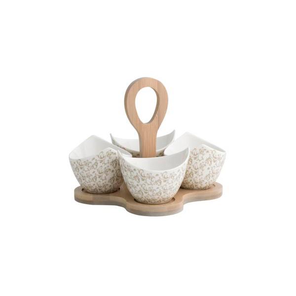 Brandanijev servirni set sestavljajo štiri skledice iz porcelana, ki so postavljene na podstavku iz bambusovega lesa - lični dodatek na vaši postreženi mizi ali pa preprosto odlična ideja za darilo. Dopolnite vašo zbirko še z ostalimi Brandani izdelki iz kolekcije "Riccioli di fata", za katere sta značilna eleganten bel porcelan in nežen cvetlični vzorec v zlatih tonih. Skledice (brez bambusovega podstavka) lahko perete v pomivalnem stroju.
