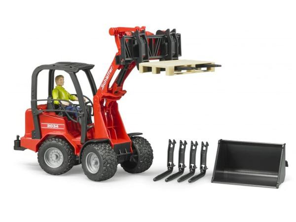 Bruder Schäffer nakladač s figuro in dodatki 02191 – Podjetje Schäffer že več kot 50 let razvija kolesne nakladalnike za kmetijstvo, industrijo ter vrtnarjenje in urejanje okolice. Schäfferjev nakladalnik je zasnovan in idealno prilagojen za visoko transportno zmogljivost v omejenih prostorih. To pomembno in prepričljivo vsestransko vozilo za vsako uspešno kmetijsko dejavnost je zdaj dodano v Bruderjevo zbirko v merilu 1:16. Za čim večjo okretnost ima vozilo, tako kot izvirnik, delujoč zgibni krmilni sistem, tudi nakladalna roka in vilice delujeta tako kot pri velikem prototipu. Za varnost figurice bworld, ki se udobno prilega voznikovemu sedežu, je vgrajen masiven varnostni drog. Ujemajoča se premična figura in komplet dodatne opreme, sestavljen iz nakladalnih vilic in palete, dopolnjujejo to veliko vozilo in zagotavljajo največjo zabavo pri igranju.
