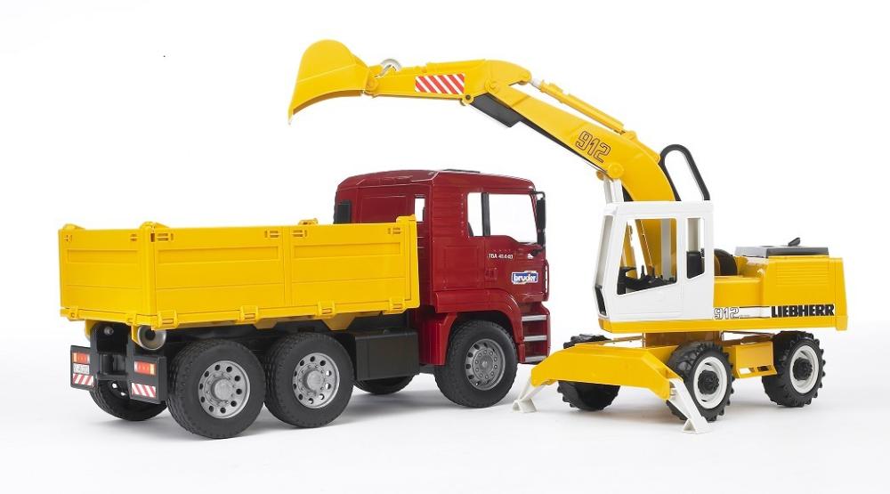 Bruder tovornjak MAN z bagerjem 02751 – Z bagerjem premaknite zemljo, jo naložite na prikolico in jo odpeljite. Vse to se zgodi v trenutku s tem kompletom, ki ga sestavljata bager Liebherr in gradbeni tovornjak MAN TGA. Stranice gradbenega tovornjaka je mogoče zložiti na treh straneh in tako razložiti naloženo blago v vse tri smeri. Korito je mogoče tudi nagniti in zapreti. Ročica bagra Liebherr je popolnoma funkcionalna, kabino in roko pa je mogoče obračati za 360°. Dve podporni nogi zagotavljata stabilnost. Za razširitev igralnih možnosti lahko gradbeni tovornjak MAN TGA opremite s svetlobnim in zvočnim modulom (št. izdelka: 02801), ki ni vključen.