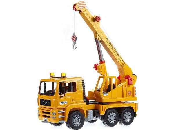 Bruder Tovornjak MAN z dvigalom 02754 – Nagibna kabina tovornjaka z žerjavom MAN omogoča pogled na blok motorja. Ogledala v vozniški kabini se lahko zložijo. Priključek žerjava je mogoče zasukati za 360°, ročico žerjava s kavljem pa je mogoče podaljšati z vrtljivim kolesom in prilagoditi višino s hidravliko. Kabelski vitel je v celoti funkcionalen s pomočjo ročice. Gumb za sprostitev pospeši spuščanje tovora. Štiri opore zagotavljajo varno oporo. Sliko dopolnjujejo pnevmatike s tekalno plastjo in priložena škatla za orodje. Za še večjo zabavo pri igranju lahko tovornjak z žerjavom MAN opremite s svetlobnim in zvočnim modulom št. izdelka: 02801 (ni priložen).