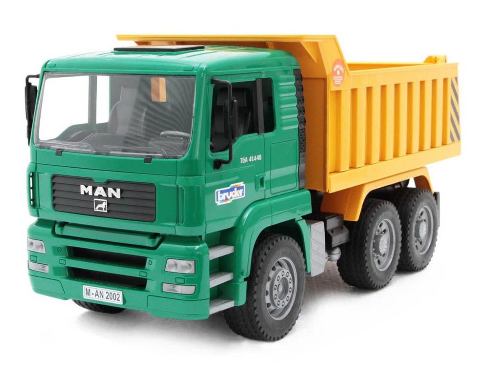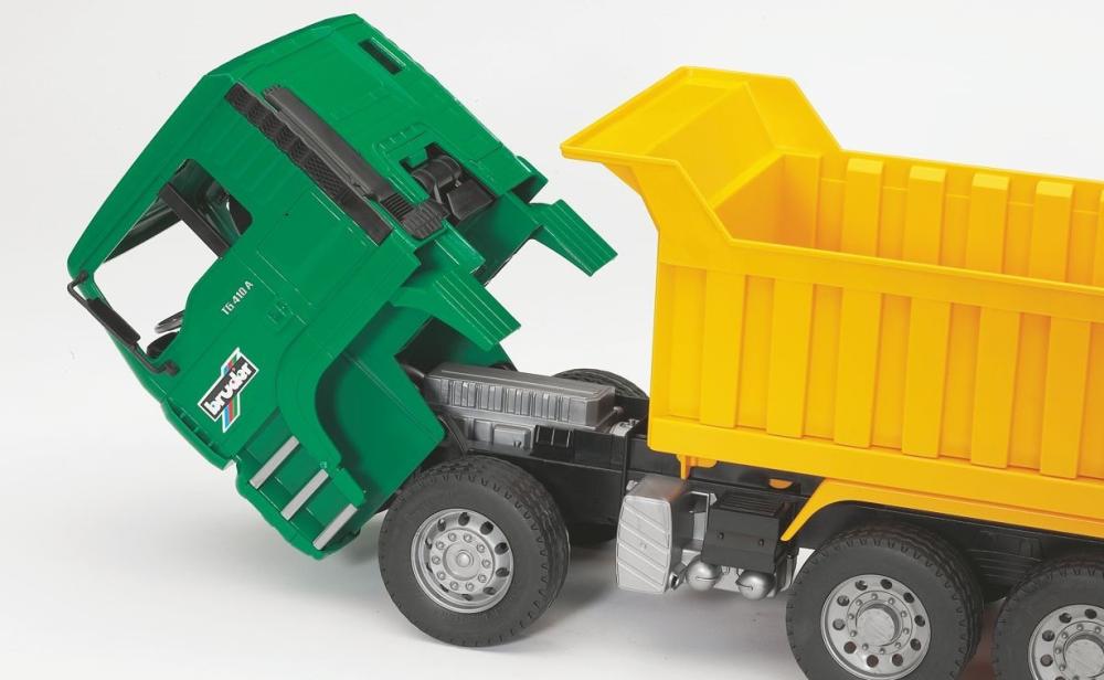 Bruder tovornjak MAN TGA 02765 – Z nagibno kabino tovornjaka MAN s prevračalno nadgradnjo si lahko ogledate blok motorja. Ogledala v vozniški kabini je mogoče zložiti. Korpus lahko nagnete in odprete prtljažna vrata. Sliko dopolnjujejo pnevmatike s tekalno plastjo. Za še večjo zabavo pri igranju lahko tovornjak MAN s prevračalno nadgradnjo opremite s svetlobnim in zvočnim modulom št. izdelka: 02801 (svetlobni modul ni priložen).