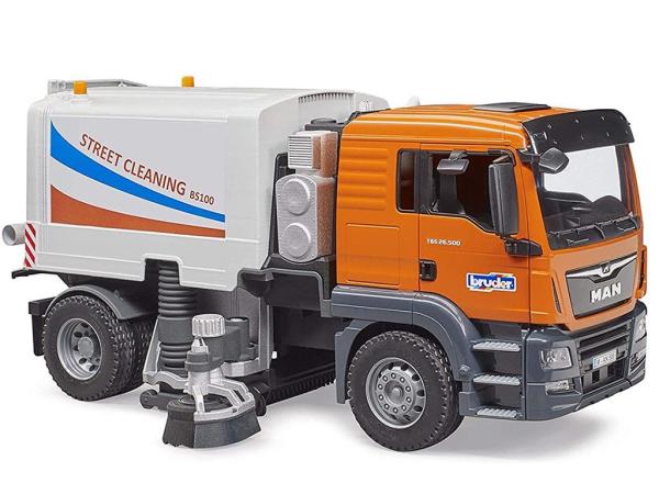 Bruder Man TGS cestni pometač 03780 – Ekipe za čiščenje cest so nepogrešljiva pomoč za vsako občino in so del vsakdanjega mestnega življenja. Nobeno drugo vozilo ne more tako učinkovito zagotoviti čistih cest in pločnikov. Novo vozilo za čiščenje cest podjetja BRUDER podrobno prikazuje delovanje tega zanimivega tovornjaka. Karoserija cestnega čistilca ima dve vrtljivi in nastavljivi čistilni krtači, ki ju je mogoče nastaviti tudi po višini. Posledično boste lahko dosegli tudi težko dostopna območja. Za čiščenje površin je pod vozilom nameščena dolga krtača, ki se poganja, ko je vozilo v gibanju.