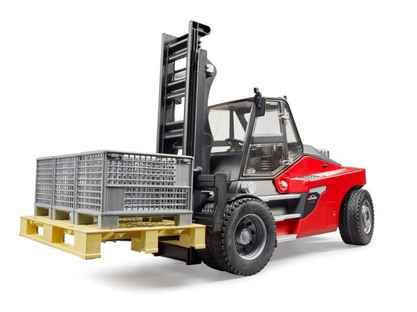 Bruder viličar Linde HT 160 02513 – Modeli Lindejeve serije HT so hitri in varčni pri ravnanju s težkimi bremeni. Zlasti pri prevozu na dolgih razdaljah ti modeli zagotavljajo posebno visoko zmogljivost rokovanja. Kot novost podjetja BRUDER je v svetu motivov gospodarskih vozil na voljo podroben model Linde HT160 iz te serije. Izvirni model navdušuje z nosilnostjo 16 ton, višino dviga 4 metre in najsodobnejšimi zasloni v vozniški kabini. BRUDERjev model nikakor ni slabši od tega. Sodobna voznikova kabina je v celoti zastekljena in ponuja opcijsko razpoložljivo figuro bworld odličen razgled v vse smeri. Viličar je opremljen z dvojnim dvižnim jamborom, katerega funkcije dvigovanja in nagibanja je mogoče upravljati z eno roko. Model ima enostavno krmiljenje, ki otrokom omogoča manevriranje v najbolj ozkih prostorih, tako kot original. Za prevoz večjih tovorov so v sklopu dobave vključene paleta in 3 mrežaste škatle. Še posebej dobro se ujemata tovornjak Scania z nakladalno roko (št. izdelka 03551) in manjši Lindejev model H30D (št. izdelka 02511) iz širokega Bruderjevega transportnega programa.