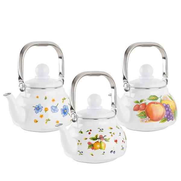 Emajliran čajnik s prostornino 1l z motivom sadja ali rožic z eleganrnim srebrnim ročajem. Lahko ga uporabite na vseh kuhalnih površinah, tudi indukciji. Pomijte ga v pomivalnem stroju.