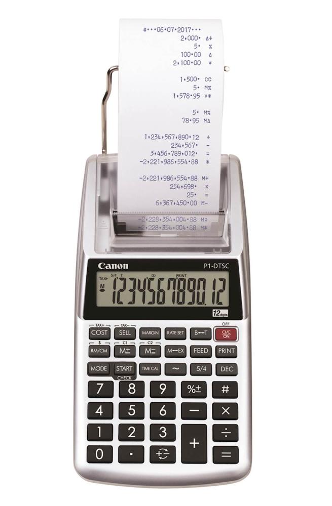 Canonov prenosni P1-DTSII kalkulator nudi odlične izpise, preprosto uporabo in malo vzdrževanja. Deluje na baterijo ali izbirno tudi na omrežno napajanje ter je majhen po velikosti in velik po zmogljivosti. Prednosti: Koristi • Prenosni 12-mestni kalkulator z izpisom na trak • Izračun davka, poslovne in valutne funkcije • Velik LCD zaslon in tipkovnica • Zunanje in notranje shranjevanje papirja • Baterijsko in omrežno napajanje (dodatni adapter AD-11) • Indikator prazne baterije