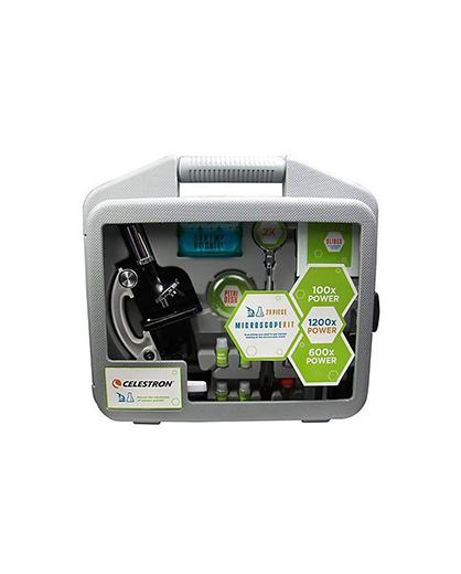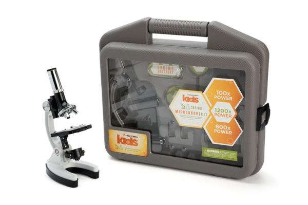 Vključuje kovinsko karoserije s 3 objektivnimi lečami (100×, 600× in 1200×). Preučite 5 pripravljenih diapozitivov ali ustvarite lastno uporabo 7 praznih