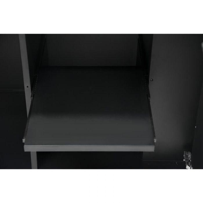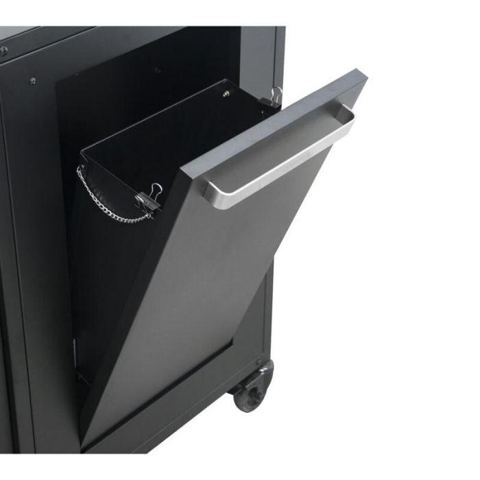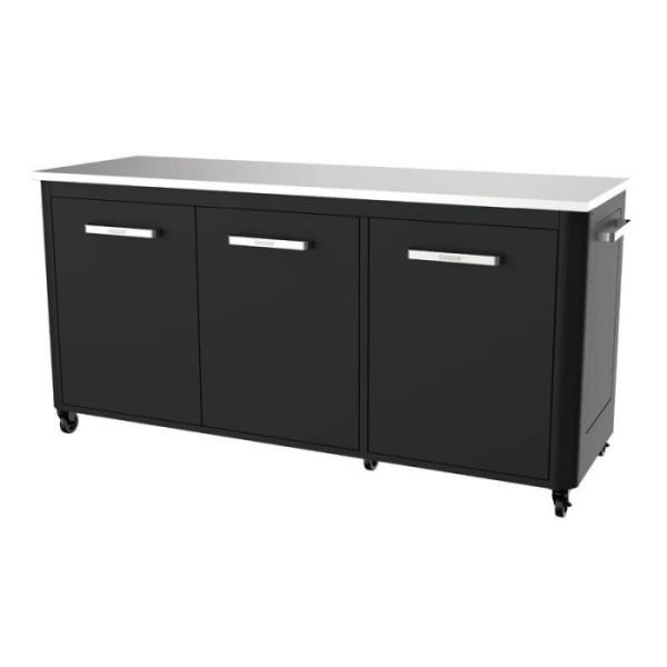 Shranjevalni prostor je razdeljen na tri dele z 2 policama na enostavno premikajočih se izvlečnih vodilih, kar omogoča enostavno shranjevanje dodatkov za žar katere imate vedno pri roki med pripravo hrane. Koš za smeti na koncu zunanje mize vam prav tako omogoča, da je miza čista in brez ostankov hrane.