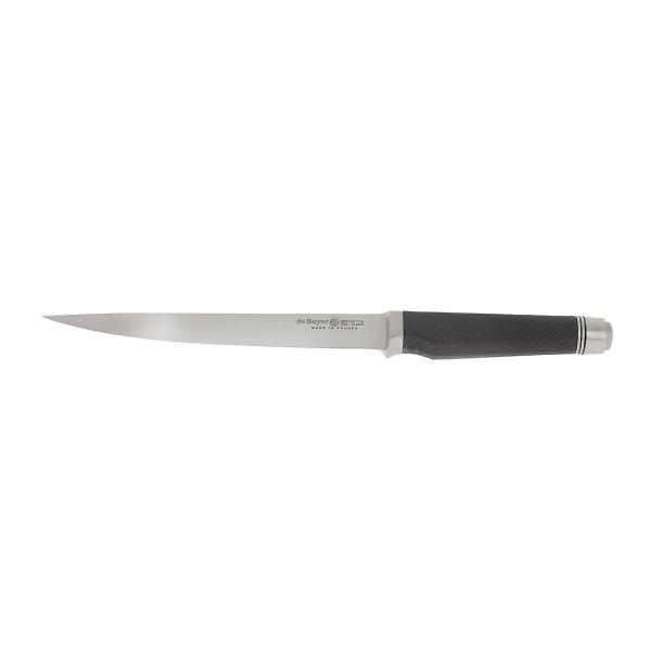Poseben nož DE BUYER FK2 za filiranje z izjemno prožnim, finim rezilom, dolgim 18 cm in ostro, koničasto špico je kot nalašč za filiranje rib, natančno rezanje in odstranjevanje majhnih, tankih ribjih kož. Kakovost serije FK2 profesionalnih nožev se kaže v izjemno vzdržljivi kaljeni zlitini nerjavečega jekla X50CrMoV15 (1.4116). Ročaj noža je narejen iz visokotehnoloških karbonskih vlaken, ki omogočajo odličen, nedrseč oprijem.
