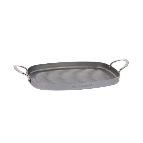 Železna ponev za žar DE BUYER MINERAL B Acier z dvema ročajema iz nerjavečega jekla je idealna ponev za pripravo vseh vrst mesa. Ponev, poimenovana »Plancha«, omogoča pripravo mesa kot na žaru, brez dodajanja maščobe. Dno ponve ima oblikovane grebene, ki zrezkom dodajo zapečen črtast vzorec, hkrati pa zmanjšujejo lepljivost površine, zato se meso lepše zapeče. Ponev je odlična tudi za pripravo Jakobovih pokrovač (capesante), kozic, rib, zelenjave … Ponve iz linije MINERAL B so narejene iz visokokakovostnega železa, prevlečenega s čebeljim voskom, ki ustvari zaščitni premaz pred oksidacijo, hkrati pa je to tudi naravna obloga proti sprijemanju živil pri prvi uporabi. Večkratna uporaba izboljša lastnosti naravnega nelepljivega sloja, pri visokih temperaturah pa železo še dodatno karamelizira sokove in naredi zrezek še bolj okusen in sočen. Ponev je primerna za vse kuhalne površine, vključno z indukcijo in vročim ogljem. Ne uporabljajte detergentov in ponve ne vstavljajte v pomivalni stroj. Ponev po vsaki uporabi sperite z vročo vodo, jo osušite, nato pa jo rahlo premažite z oljem in shranite v suhem prostoru, da preprečite rjavenje.Francoski proizvajalec De Buyer je vodilni na področju proizvodnje visokokakovostne kuhinjske posode že od leta 1830. Vsi njihovi izdelki so narejeni iz 100% naravnih materialov, prav tako je okolju prijazen tudi sam postopek izdelave. Posoda je namenjena vsem tistim, ki dajejo velik poudarek zdravemu načinu kuhanja, skrbi za okolje, prisegajo na visoko kakovost materialov, polnost okusov in sledijo tradiciji v kuhanju. Primerna je tako za domača gospodinjstva kot za profesionalno uporabo, posoda De Buyer namreč svoj svetovni ugled uveljavljala v najprestižnejših hotelih in restavracijah.