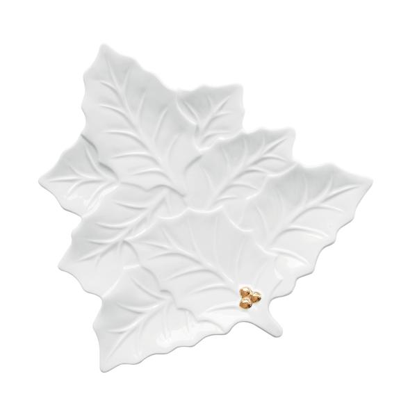 Božično-novoletni EASY LIFE SERVIRNI KROŽNIK HOLLY&BERRIES v obliki lista božične lobodike in dodatkom zlatih jagod se bo krasno podal na novoletno okrašeno mizo. Trpežen in izjemno oblikovan porcelan bo navdušil vaše goste. Krožnik je lahko tudi lepo darilo, saj je pakiran v darilni embalaži. Ni primeren za pomivanje v pomivalnem stroju in uporabo v mikrovalovni pečici.