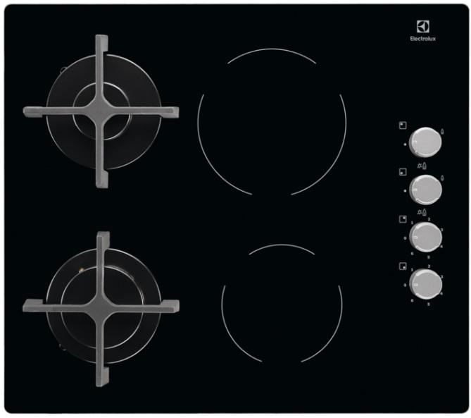 Kombinirana kuhalna plošča Electrolux EGE6172NOK ima 2 plinska kuhališča in 2 steklokeramična kuhališča, ki se upravljajo na desni strani z vrtljivimi gumbi. Plošča ima indikatorje preostale toplote in funkcijo samodejnega varnostnega izklopa.