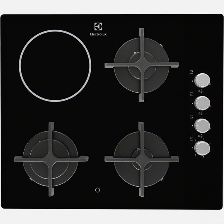 Kombinirana kuhalna plošča Electrolux EGE6182NOK ima 3 plinska kuhališča in 1 steklokeramično kuhališče, katera se upravljajo na desni strani z vrtljivimi gumbi. Plošča ima indikatorje preostale toplote in funkcijo samodejnega varnostnega izklopa.