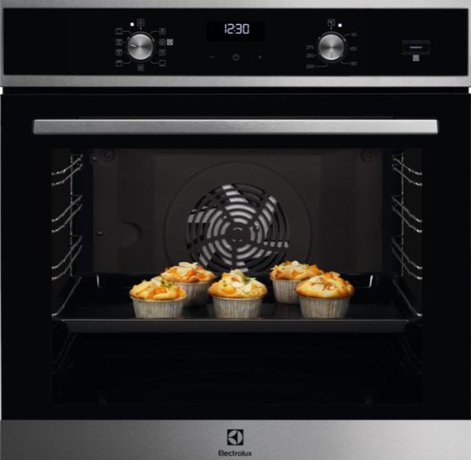 Vgradna pečica Electrolux EOD5C70X z ventilatorjem ima 72 l prostornine in spada v energijski razred A. Na voljo je 9 funkcij in timer s 5 nastavitvami, katere nastavite enostavno, s pomočjo mehanskih tipk in izvlečnih gumbov. Pregled nad izbranimi funkcijami prikazuje LED prikazovalnik. Pečica je opremljena s parom teleskopskih vodil, 2 pladnji in 1 rešetko.