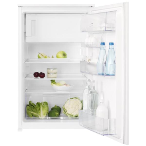 Vgradni hladilnik Electrolux LFB2AF88S višine 88 cm spada v energijski razred F in ima prostornino hladilnega dela 109 l in prostornino zamrzovalnega dela 14 l. Za shranjevanje ima na voljo 2 veliki stekleni polici in 1 velik predal za sadje in zelenjavo v hladilnem delu ter 1 zamrzovalni predal. Upravljanje temperature je elektronsko, na dotik v hladilniku.