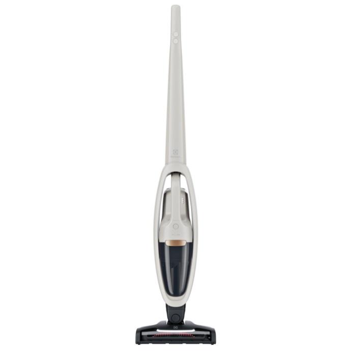 Pokončni baterijski sesalnik Electrolux WQ61-44SW 2v1 ima ergonomski dizajn in krtačo s tehnologijo BrushRollClean™, pri kateri s pritiskom na gumb enostavno očistite nadležna vlakna in lase, ki obtičijo v nje. Sesalnik ima 2 stopnji delovanja. Z njim lahko sesate do 45 min. Priložen je 2v1 nastavek za reže in podaljšani nastavek. Baterija je zamenljiva.