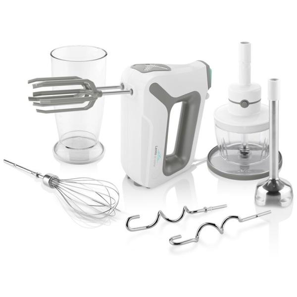 Ročni mešalnik Lento 5v1 z močjo 660 W gnete, stepa, miksa, seklja in drobi. Zahvaljujoč inovativni obliki metlic za stepanje, je zelo tih.