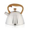 Klasično oblikovan čajnik s piščalko in gumbom Eva (3l) z modernim videzom z osupljivo reliefno oblikovano površino in ročajem v imitaciji lesa, bo vaši kuhinji dodal sodoben šik videz. Izdelan je iz kakovostnega nerjavečega jekla in je primeren za vse kuhalne plošče, vključno z indukcijo, zaradi česar je idealen za vse kuhinje. Ročaj je oblikovan za enostavno in udobno rokovanje ter omogoča boljši oprijem pri uporabi. Preprost gumb na njem varno obrne piščalko stran od izliva in tako zagotovi, da lahko brez težav natočite vročo vodo. Žvižgajoči kotliček bo poskrbel, da boste slišali, da je voda zavrela, ne glede na to, kje v vašem domu ste. Čajnik pomijte ročno.