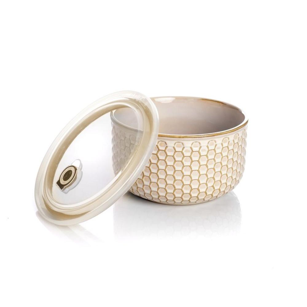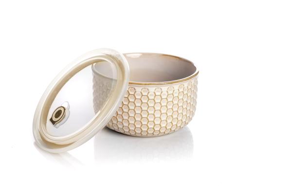 OKROGLA SKLEDA S POKROVOM s premerom 20 cm je izdelana iz toplotno odporne keramike, zato je primerna za uporabo v mikrovalovni pečici. Plastični pokrov hermetično zapira posodo, zato je skleda idealna za shranjevanje živil. Enostavno jo lahko pomijete v pomivalnem stroju. Reliefno okrašena keramika je značilen slog linije Caracas. Dopolnite jo lahko tudi z drugimi izdelki iz te linije.
