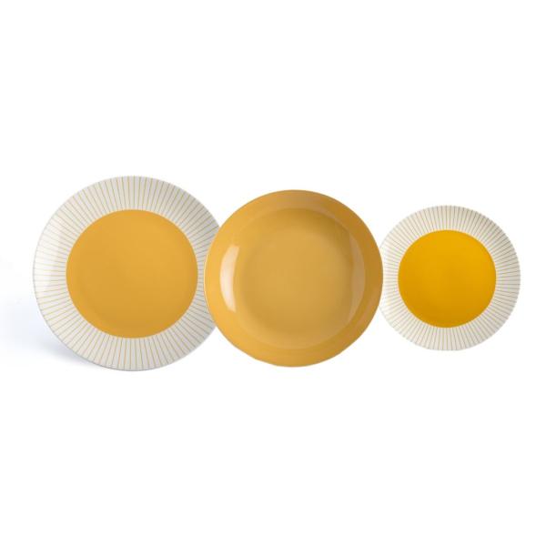18-delni set je sestavljen iz: 6 velikih plitvih krožnikov premera 27 cm, 6 globokih krožnikov premera 21 cm in 6 malih desertnih krožnikov premera 19 cm.