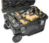 Stanley Fatmax srednje veliki kovček - Profesionalni robustni kovček za orodje z zatesnitvijo proti vodi IP53 - Trpežna polipropilenska konstrukcija s širokim kovinskim izvlečnim ročajem in zapahi - 7" široka gumirana kolesa in zvišano dno za boljše manevriranje na delovnem mestu - Ima odprtino za ključavnico za večjo varnost in V utor za žaganje in rezanje - Opremljen s kovinsko prečko za pritrjevanje dodatne opreme - Vključena širok odstranljiv pladenj in dodatek za pokončno shranjevanje ročnega orodja
