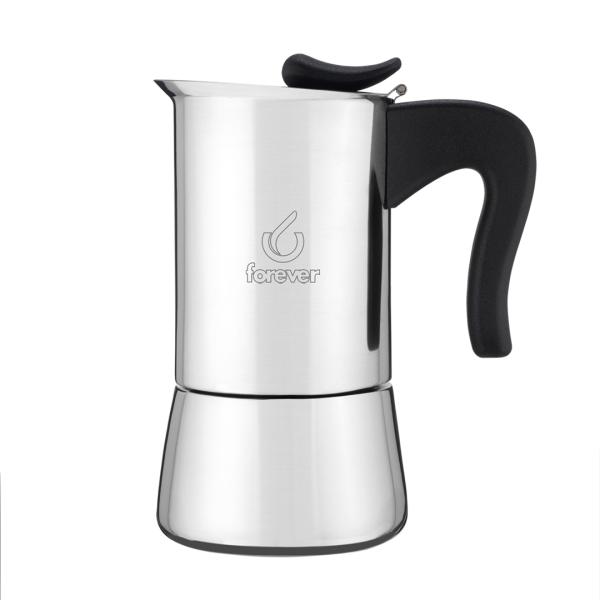 FOREVER KAFETIERA MISS SPLENDY se bo s svojo elegantno obliko lepo podala v vsako kuhinjo in štedilnik. Ravni in ukrivljeni elementi se med seboj dopolnjujejo. Visokokakovostno trpežno nerjaveče jeklo in silikonsko tesnilo imata dolgo življenjsko dobo. Primerna je za uporabo na vseh kuhalnih površinah, tudi indukciji. Kafetiero lahko enostavno razstavite in pomijete v pomivalnem stroju. Na voljo v več dimenzijah.