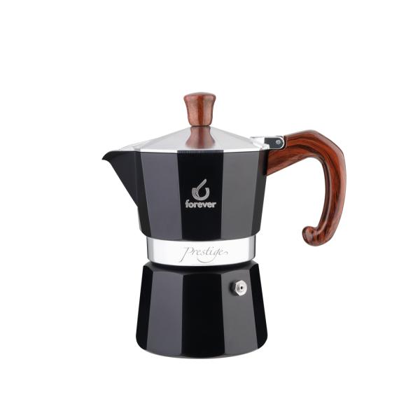 FOREVER KAFETIERA MISS PRESTIGE RADICA je izdelana iz aluminija, ki je na zunanji strani pobarvan z vedno elegantno črno barvo. Ergonomski ročaj v imitaciji lesa ustvarja impresiven in nevsakdanji videz. Kakovostna izdelava in celoten izgled sta le eden izmed razlogov, zakaj izbrati Forever kafetiero Radica. Silikonsko tesnilo in funkcionalen izliv preprečujeta kapljanje. Njena klasično zasnovana oblika je izdelana iz aluminija varnega za živila, ki je primeren za uporabo na vseh štedilnikih, RAZEN za indukcijo. Če imate indukcijski štedilnik priporočamo FOREVER KAFETIERO MISS PRESTIGE. Pomijte jo ročno.