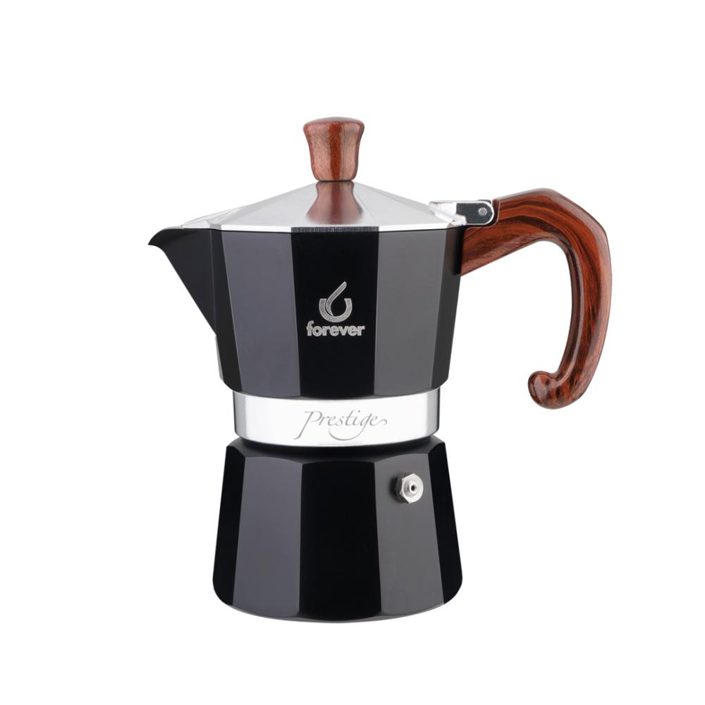 FOREVER KAFETIERA MISS PRESTIGE RADICA je izdelana iz aluminija, ki je na zunanji strani pobarvan z vedno elegantno črno barvo. Ergonomski ročaj v imitaciji lesa ustvarja impresiven in nevsakdanji videz. Kakovostna izdelava in celoten izgled sta le eden izmed razlogov, zakaj izbrati Forever kafetiero Radica. Silikonsko tesnilo in funkcionalen izliv preprečujeta kapljanje. Njena klasično zasnovana oblika je izdelana iz aluminija varnega za živila, ki je primeren za uporabo na vseh štedilnikih, RAZEN za indukcijo. Če imate indukcijski štedilnik priporočamo FOREVER KAFETIERO MISS PRESTIGE. Pomijte jo ročno.