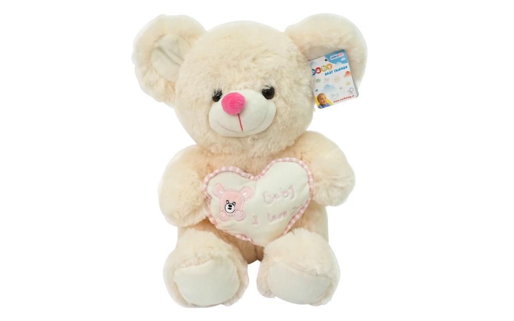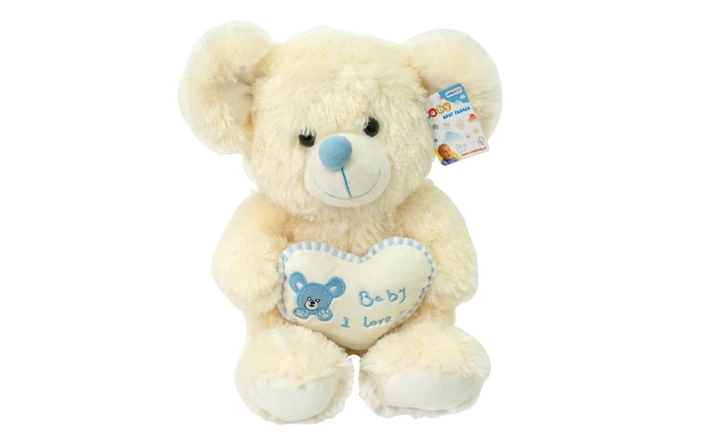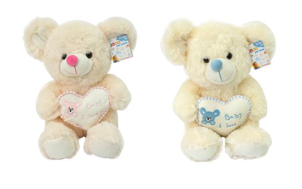 Mehkoba in belina 33 cm visoke sedeče plišaste miške, ki v roki drži srček obrobljen z modro ali roza nitko in napisom. Tudi prisrčen nosek in nasmeh je roza ali modre barve.