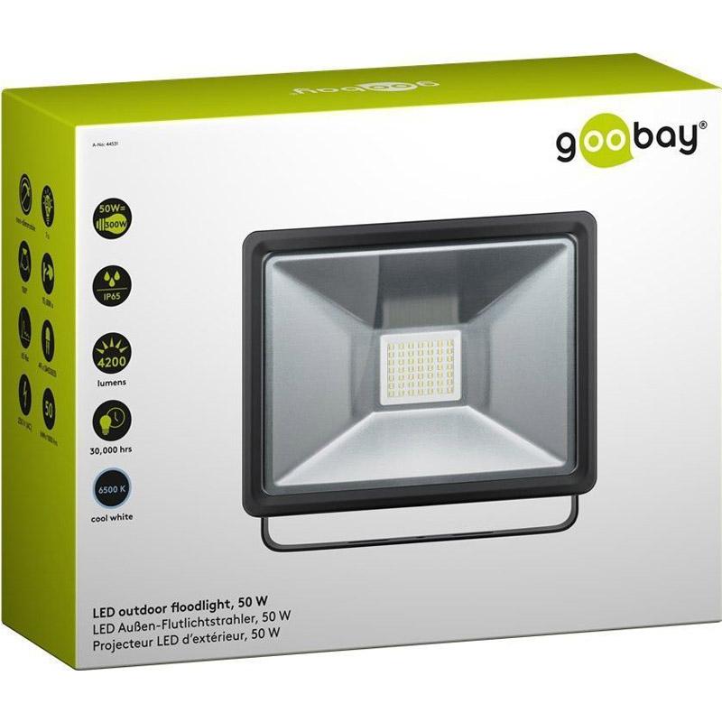 GOOBAY LED 50W zunanje svetilo je primerno za montažo pri vhodih v zgradbe, pri dovoznih poteh, na vrtovih ... Nudi vam LED tehnologijo za maksimalno učinkovitost ter zelo dolgo življenjsko dobo, zahvaljujoč integriranemu, neodstranljivemu svetlobnemu viru LED. Ohišje svetila je iz aluminija, odporno proti udarcem in zunanjim vplivom. Stetilo je primerno za uporabo na prostem (IP65). Nudi nastavljiv nosilec za montažo na steno ali pritrditev na stojalo.