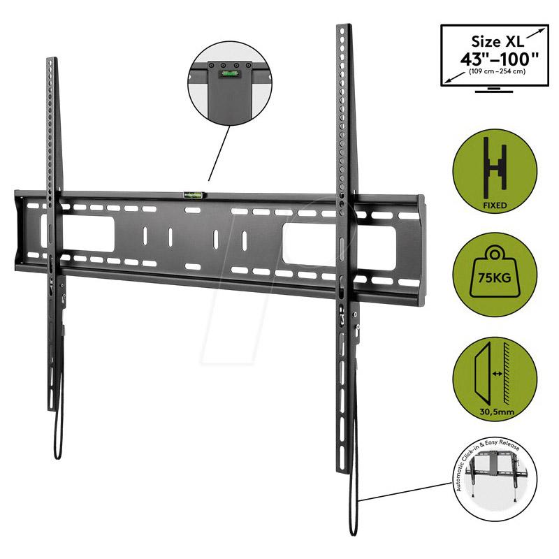 GOOBAY TV Pro Fixed XL 109cm-254cm (43"-100") stenski nosilec za TV, z največjo težo 75kg, je izredno tanek in je od stene oddaljen le 30,5mm, da zaključi eleganten videz ultra tankih televizorjev. Vzmetna zapora z enostavno rešljivimi kabelskimi ključavnicami omogoča enostavno in varno pritrditev vašega zaslona na steno.
