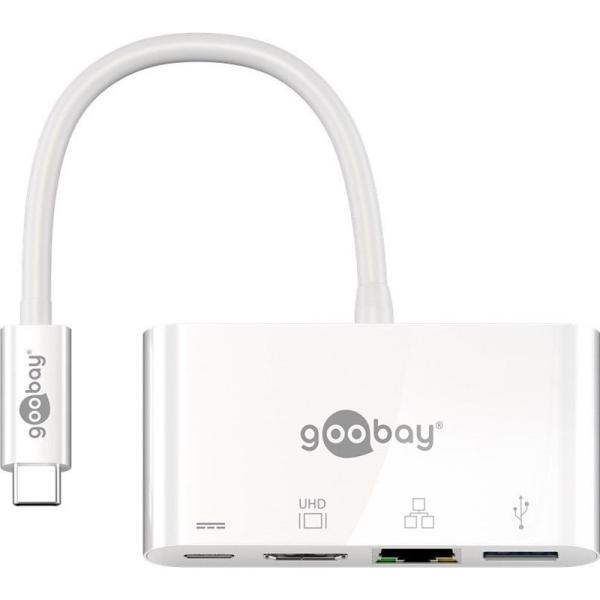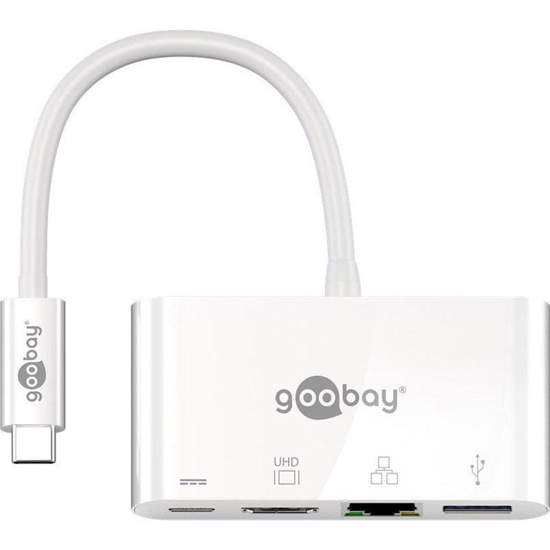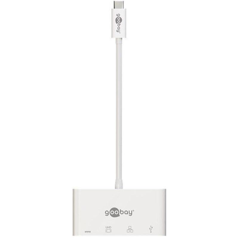 GOOBAY USB-C multi - adapter zrcali signal iz USB-C na Ethernet + in USB naprave. USB-C priključek za hitro polnjenje s prenosom podatkov do 5 Gbps. Podpira HDMI ločljivost do 4K x 2K @ 30 Hz. Funkcija polnjenja preko USB-C pri do 60W.