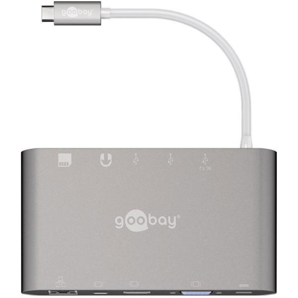 GOOBAY USB-C multi adapter / Dock postaja doda USB-C napravi naslednje priključke: mrežni priključek, HDMI, VGA, mini DisplayPort, 3x USB 3.0, 3,5 mm priključek in režo za SD / micro SD kartico.