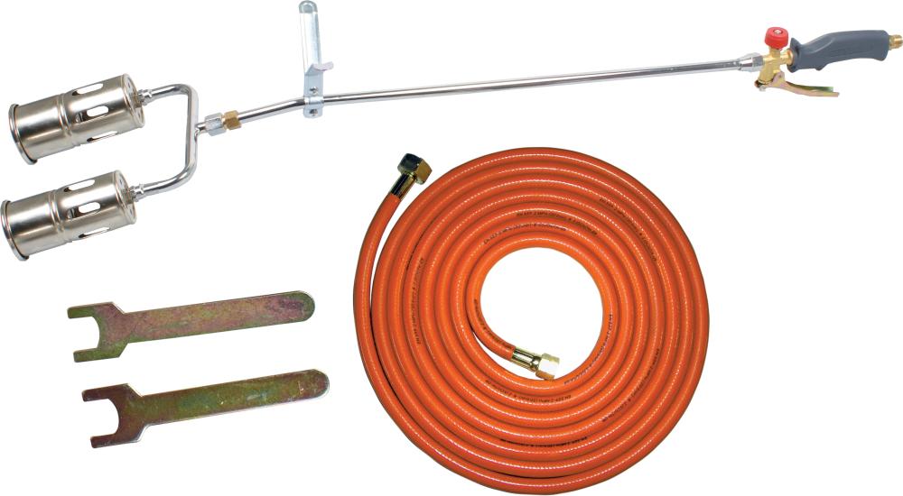 Gorilnik z dvojnim nastavkom. Napajanje na UNP. Priložena opora gorilnika. Dve možni nastavitvi plamena. Cev ustreza zahtevam EN ISO 9012 in EN 16436-1.