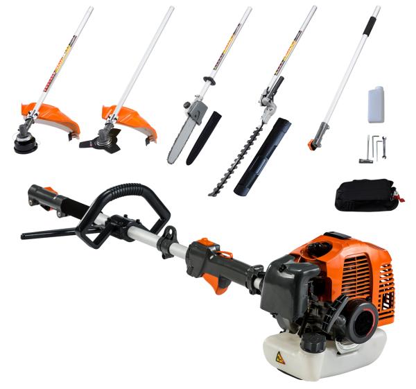 Set vključuje 4 priključkov - priključek za košnjo z naylon glavo, priključek za obrezovanje žive meje, višinski obrezovalnik in podaljšek cevi.