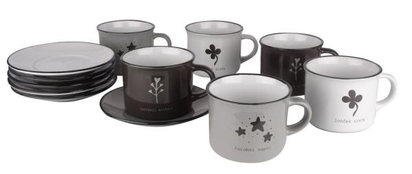 Set 6 lončkov iz porcelana. Z prisrčnim napisom, ki vam bo polepšal dan. Lončki so namenjeni serviranju bele kave ali ostalih toplih napitkov. Dizajn je obstojen zaradi česar so lončki primerni za pomivanje v pomivalnem stroju.