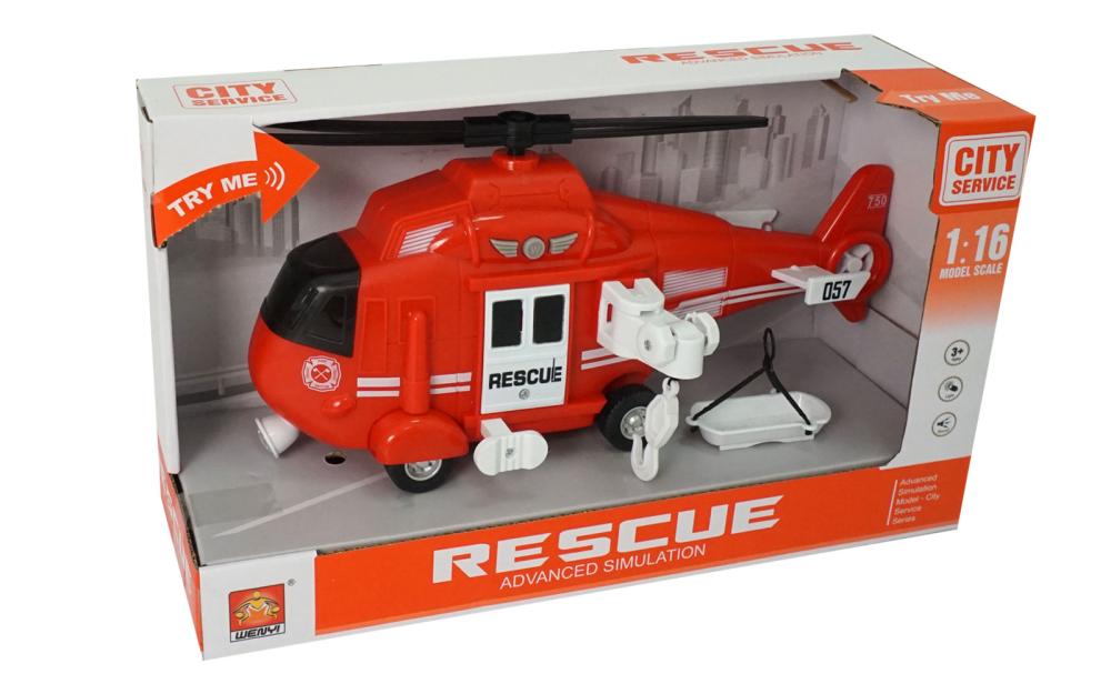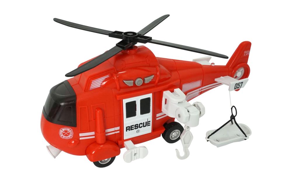 Baterijski reševalni helikopter velikosti 30 cm za delovanje potrebuje 3 baterije tipa AG13 (LR44) 1.5V. Pritisnite na gumb w nad vrati. Zaslišal se bo zvok, utripali bosta lučki. S pritiskom belega gumba se zavrti rotor na helikopterju. Z vrtenjem dveh malih belih gumbov pa dvigate ali spuščate priloženo reševalno nosilo. Vozilo ima frikcijski pogon.