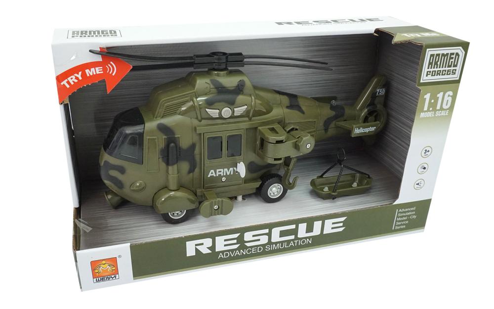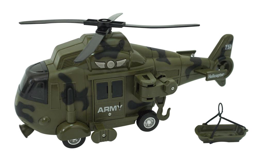 Baterijski vojaški helikopter velikosti 30 cm za delovanje potrebuje 3 baterije tipa AG13 (LR44) 1.5V. Pritisnite na gumb w nad vrati. Zaslišal se bo zvok, utripali bosta lučki. S pritiskom zelenega gumba se zavrti rotor na helikopterju. Z vrtenjem dveh malih zelenih gumbov pa dvigate ali spuščate priloženo reševalno nosilo. Vozilo ima frikcijski pogon.