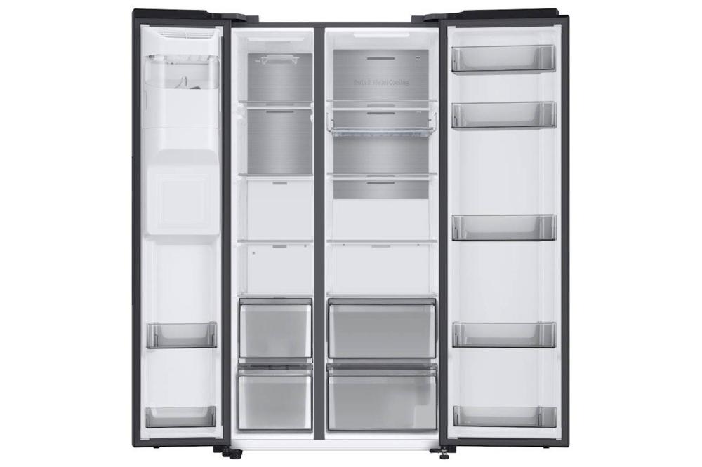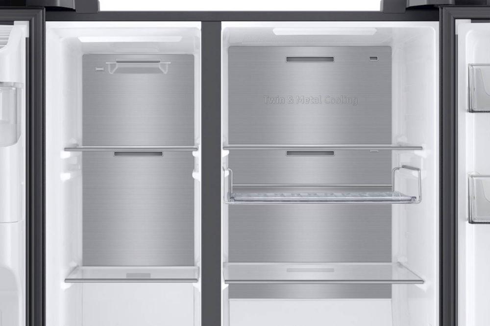 Samsung RS8000 hladilnik ponuja več prostora za shranjevanje, saj SpaceMax Technology™ omogoča dodatno notranjo kapaciteto brez sprememb zunanjih dimenzij (100 l več kot običajni modeli). Twin Cooling Plus™ poskrbi, da ostane hrana do dvakrat bolj vlažna in sveža*. Twin Cooling Plus™ tehnologija optimizira temperaturo in vlažnost v hladilniku in zamrzovalniku z neodvisnim hlajenjem. Bolje ohranja hrano in ščiti njen okus tako, da preprečuje mešanje vonjav. 36 dBA omogoča tiho delovanje. Nizka poraba električne energije.