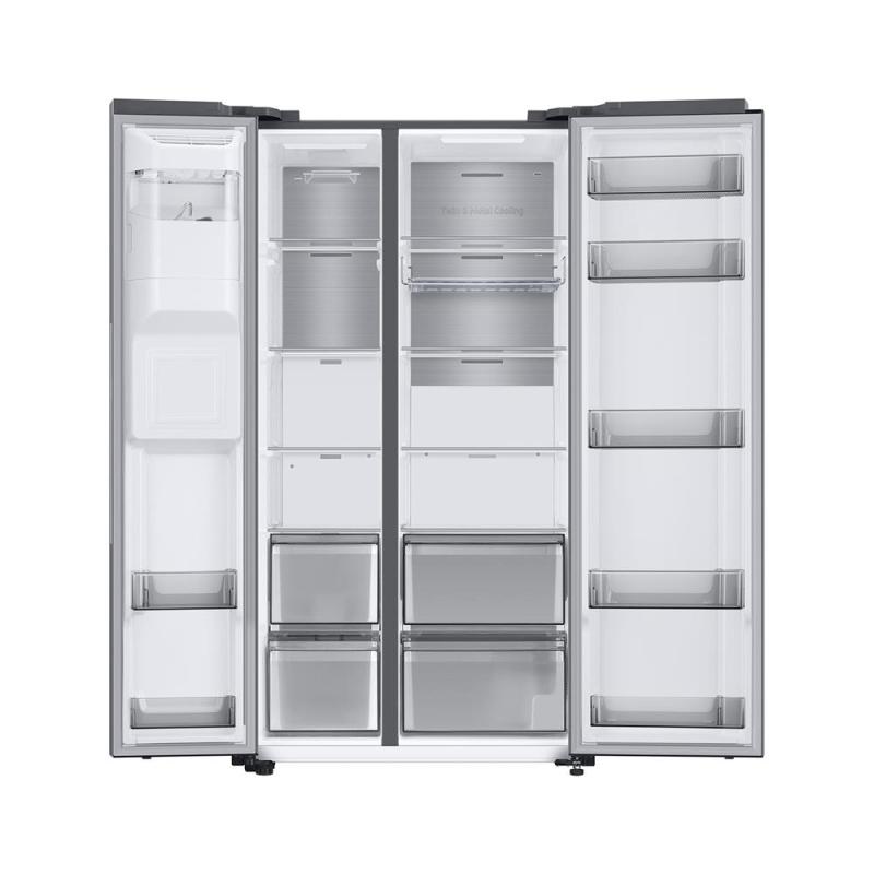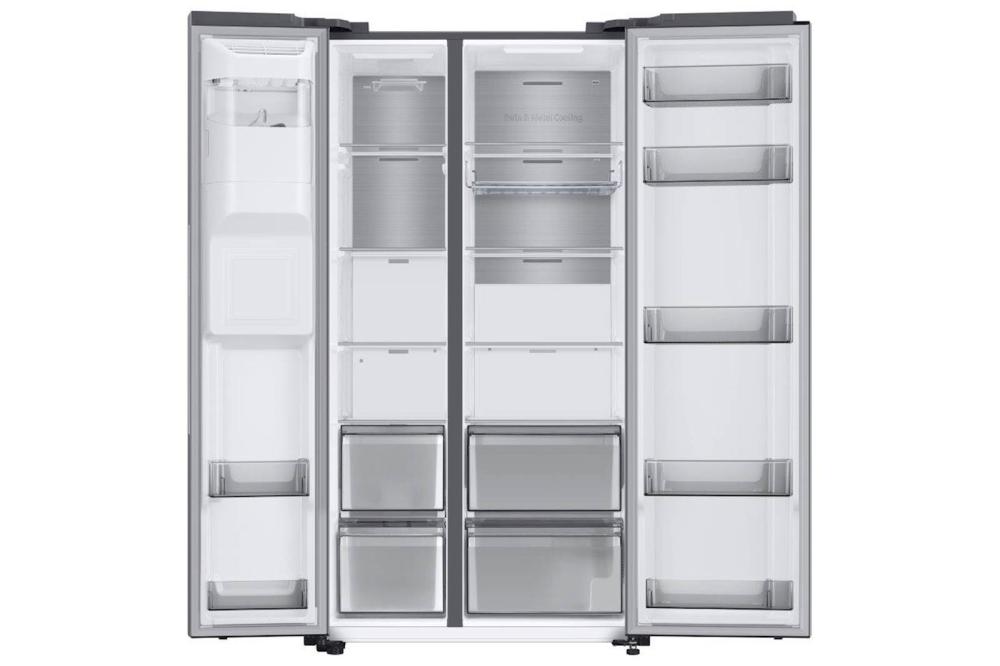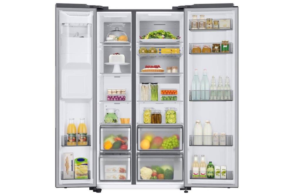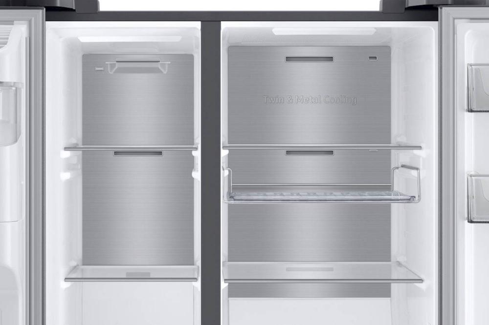 Samsung RS8000 hladilnik ponuja več prostora za shranjevanje, saj SpaceMax Technology™ omogoča dodatno notranjo kapaciteto brez sprememb zunanjih dimenzij (100 l več kot običajni modeli). Twin Cooling Plus™ poskrbi, da ostane hrana do dvakrat bolj vlažna in sveža*. Twin Cooling Plus™ tehnologija optimizira temperaturo in vlažnost v hladilniku in zamrzovalniku z neodvisnim hlajenjem. Bolje ohranja hrano in ščiti njen okus tako, da preprečuje mešanje vonjav. 36 dBA omogoča tiho delovanje. Nizka poraba električne energije.