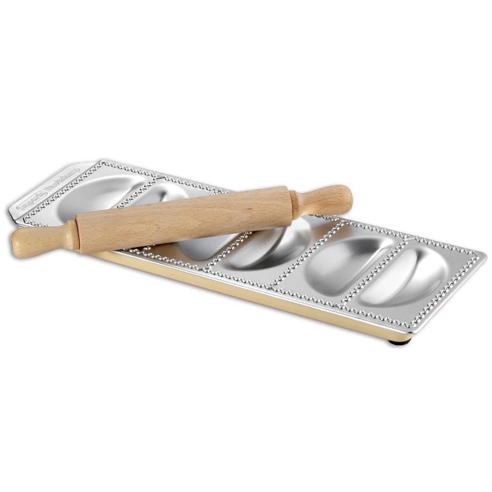 Za dobro stabilnost in zaščito občutljivih površin je kalup na spodnji strani opremljen z gumijastimi nogicami. Navodila: kalup za raviole pomokajte in ga pokrijte s sveže pripravljenim listom testenin, ki ga na tanko zvaljate z valjarjem ali pa s strojčkom za testenine. Testo nežno potisnite v odprtine in jih napolnite s polnilom po vaši izbiri. Robove rahlo namažite z rumenjakom ali vodo in nanje položite drugi list testenin. S pomočjo malega priloženega valjarja iz bukovega lesa stisnite obe plasti skupaj. Z rahlim pritiskom odstranite odvečen zrak in razrežite posamezne raviole. Ko boste kalup obrnili bodo ravioli padli iz njega. Preglejte vsak raviol in se prepričajte, da je ob robovih dobro zaprt. Položite jih na pomokan krožnik.